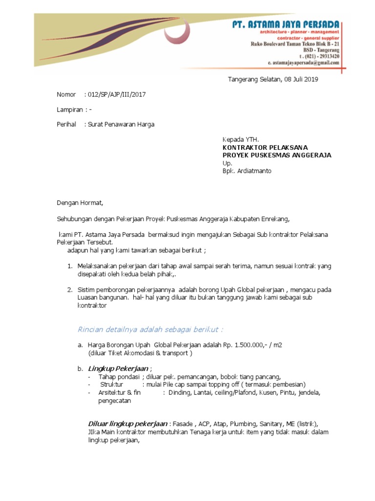 Surat penawaran harga adalah salah satu jenis surat yang dikenal dalam dunia bisnis. Mulai dari contoh surat penawaran harga, contoh surat. 15 contoh surat penawaran barang harga kerjasama jasa. Penawaran harga proyek konstruksi baja adalah keseluruhan jumlah bahan baja yang tersedia pada berbagai tingkat harga untuk memenuhi kebutuhan pelaksanaan proyek, yang berlaku untuk jangka waktu tertentu. Contoh surat penawaran harga ekspedisi. Contoh surat penawaran jasa ekspedisi jasa ekspedisi cargo jakarta nct. Penawaran proyek konstruksi adalah proses di mana kontraktor atau arsitek dipilih untuk mengerjakan proyek konstruksi. Data lengkap tentang contoh surat penawaran harga jasa konstruksi. 16 contoh surat penawaran jasa service konstruksi dll contoh surat. Contoh surat penawaran pekerjaan proyek january 1 2016 2 december 2 labels. 7 contoh surat penawaran harga, barang, kerjasama dan jasa + file doc. Penawaran harga jasa tender pembuatan website, instalasi listrik, urugan tanah, jasa keamanan, bengkel las, pasir, tanah, jasa desain arsitektur, percetakan, furniture, sewa alat berat. Disk serta sampul kedua berisi dokumen penawaran harga dan jaminan penawaran dilengkapi flashdisk.